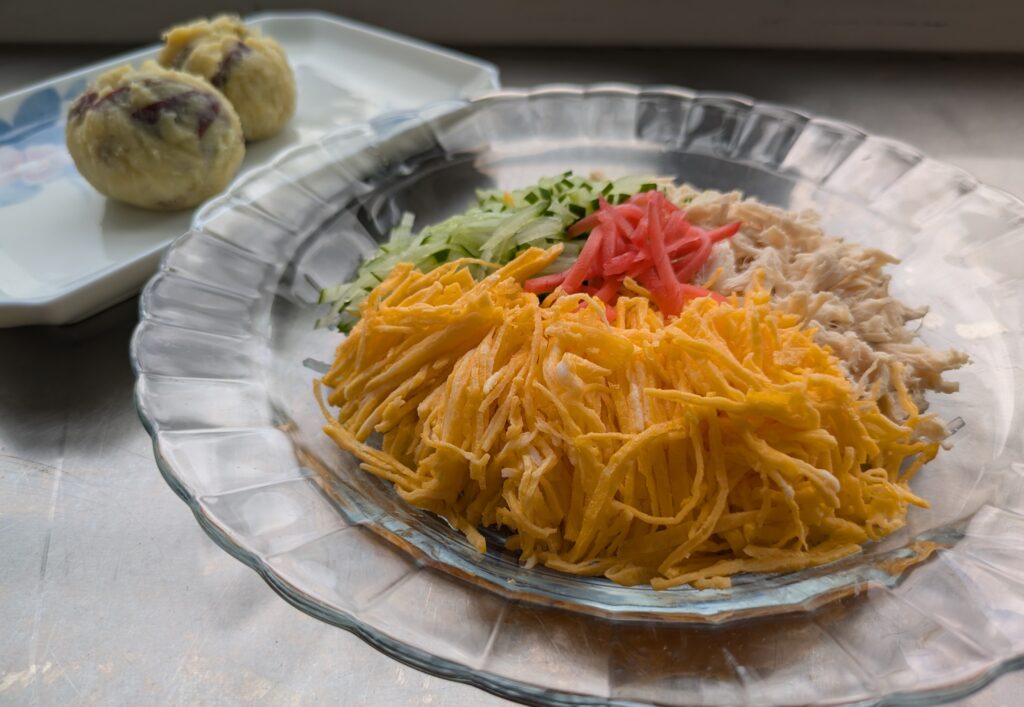 今回の実習で調理した春雨の冷拌五絲(リャンパンウースー)とさつまいもの茶きん絞りも摂食嚥下能力が低下している方にも食べやすい工夫をこらした料理です。