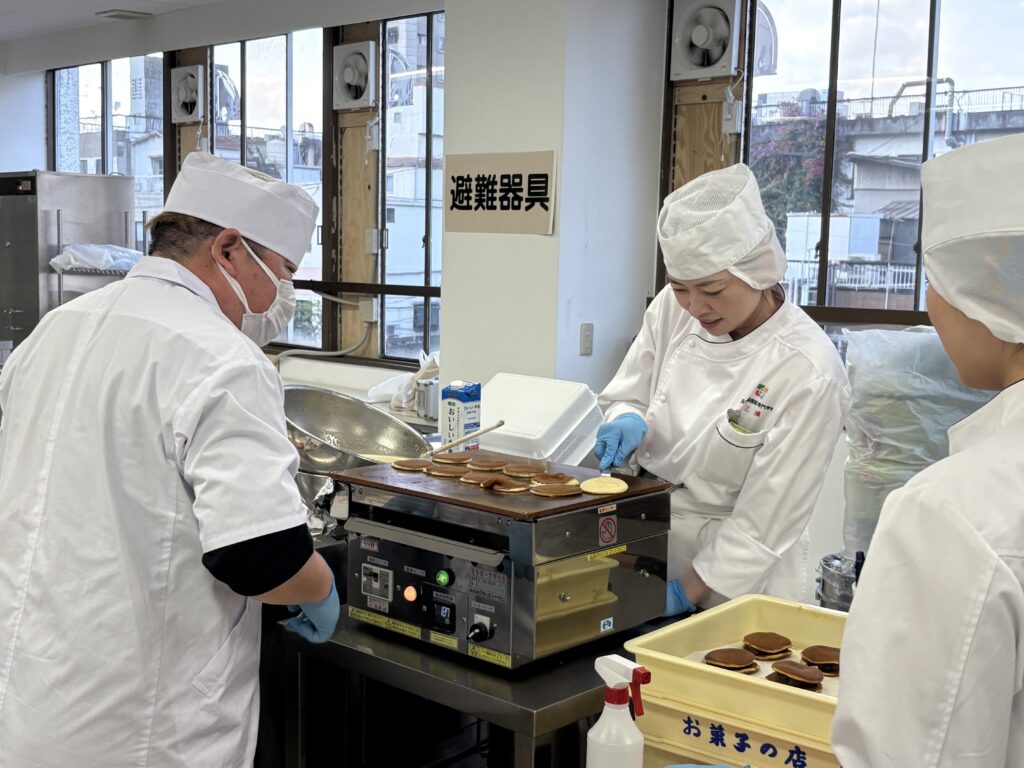 生地を流すのも、生地をひっくり返すのも熟練の技が必要。慣れてきたところで、実習終了となりざんねんでしたが、イベントで実演販売などしてみたいねという夢もうまれました。