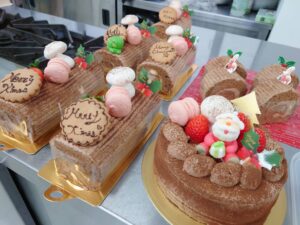 りんごのコンポート、クレームブリュレ、クリスマスツリーのタルトと豪華なデザートが勢ぞろい。