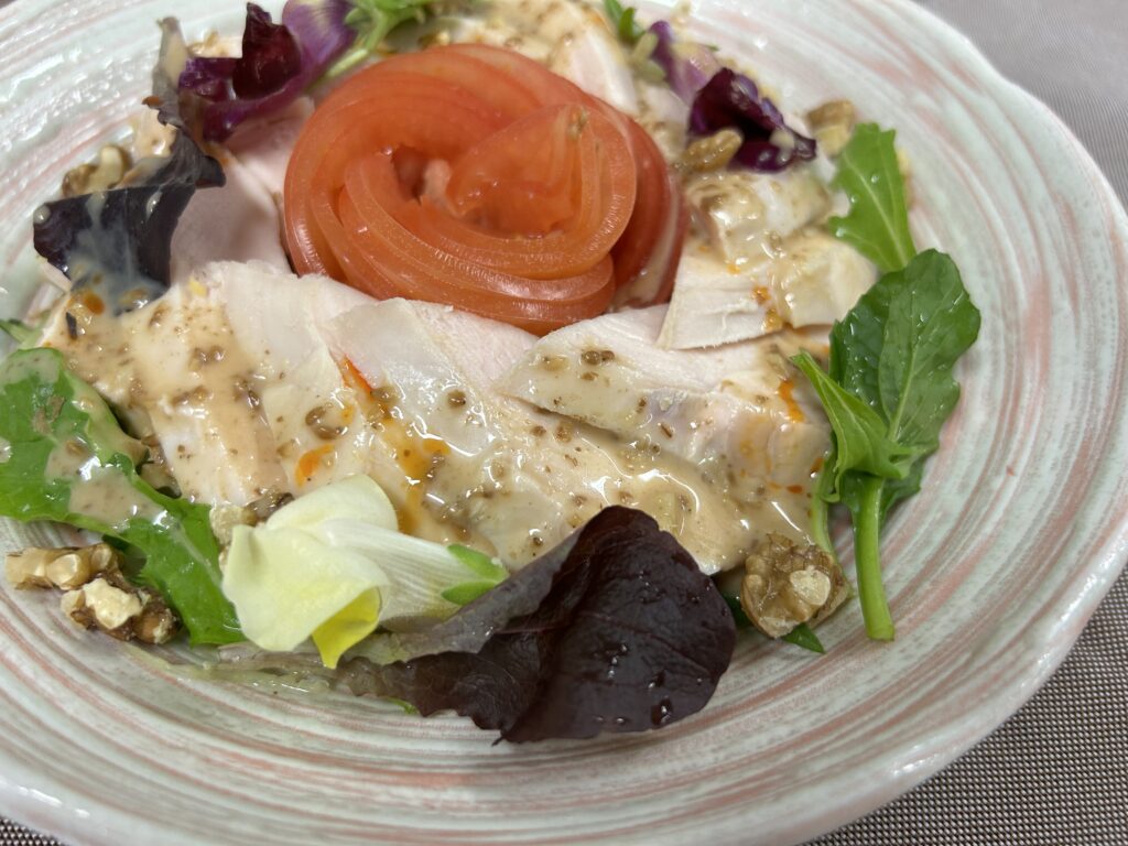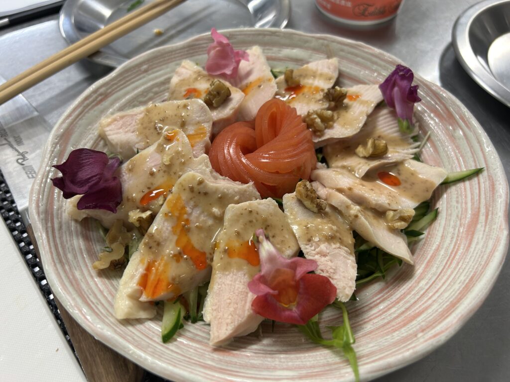 エディブルフラワー(食用花)を盛り付けに使い、彩り豊かな棒棒鶏ができました。