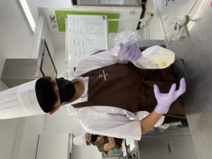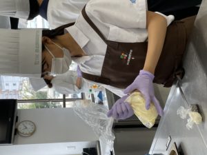 コロナウィルス感染予防の為、時間短縮とみんなで試食はせずに、持ち帰りで実施。10:00スタート学校説明、入試の説明、入試対策等の説明、実習開始:岩坂先生 失敗しないコツと現在の職場でどんなことをしているのかなど、雑談しながら手順を説明、在校生が補助に付き調理開始、在校生とお話しながら、みんな楽しく調理してました1時間30分ほどで完成ラッピングして、各自解散12時30分ごろ終了
